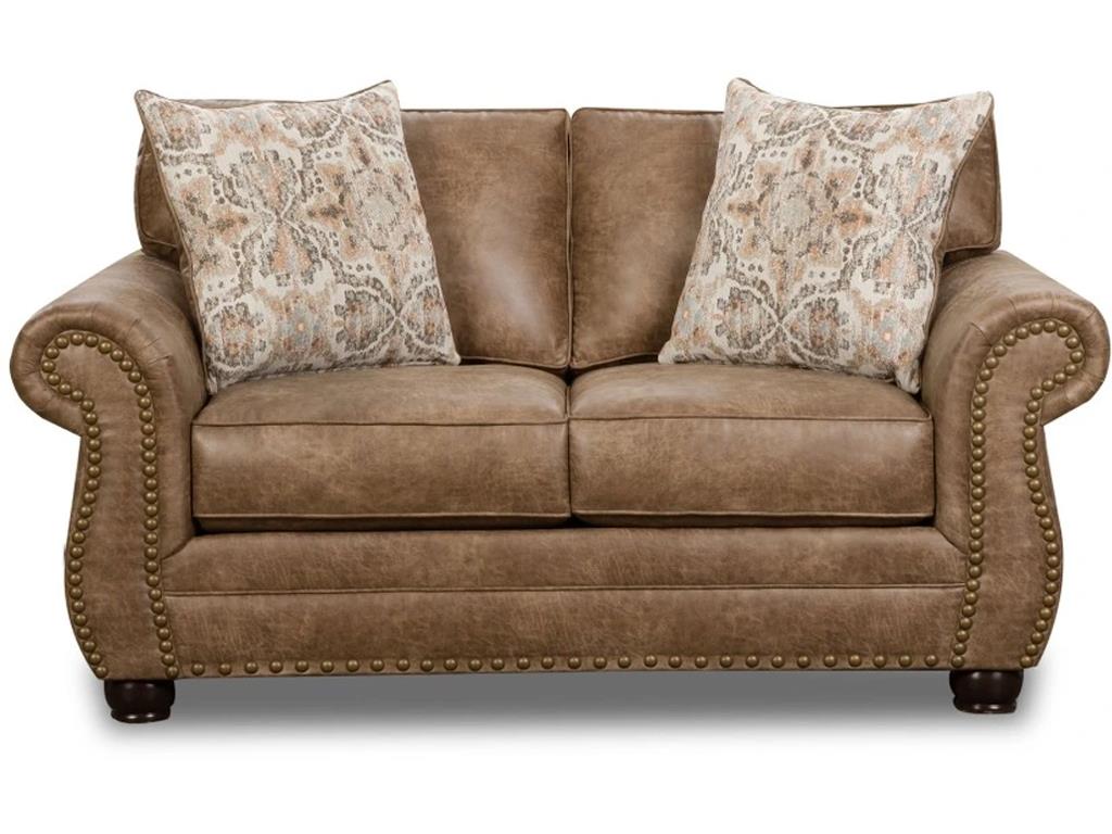Item Long Description | BEHOLD Woodland Loveseat with Rolled Arms, Nail Head Trim Accent, Wooden Turned Legs, Oversized Back Cushions, Upholstered Microfiber Fabric, Color: Brown |